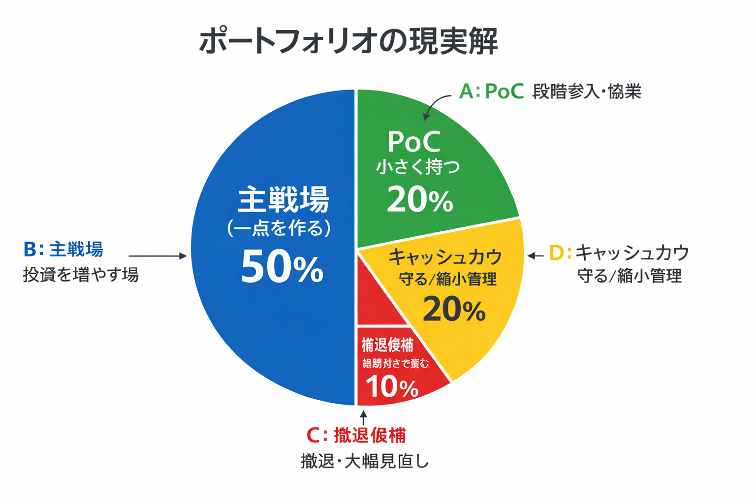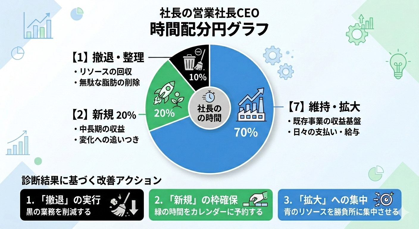 なぜ2割か? 1割では少なすぎ、変化の激しい現代では、既存事業の陳腐化に追いつけません。逆に3割を超えると、失敗した時のダメージが本業を揺るがします。「3つ挑戦して1つ当たれば良い(大勝ちはしなくてよいが、損はしないで事業として成り立つ、でまずは可)」という攻守のバランスが最も取れるのが2割です。 - 【1】撤退・整理・見直し(リソースの回収)